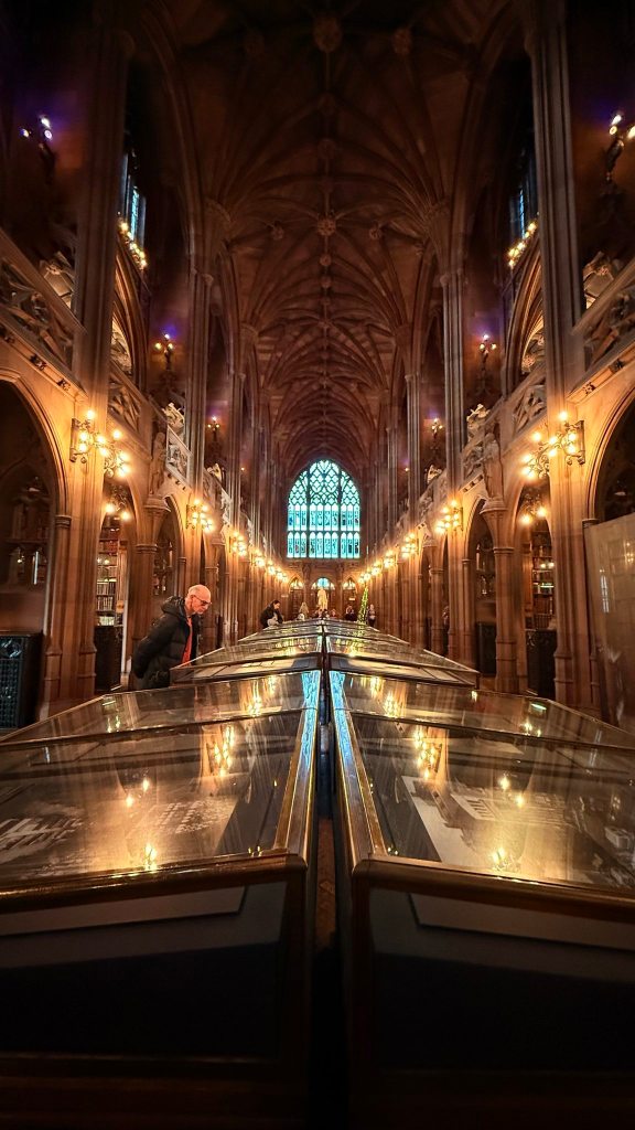 Het uitgaansleven is er bij tijden heerlijk ordinair en tegelijkertijd loop je vol verbazing door de muisstille bibliotheek waar tientallen scholieren en studenten over hun studieboeken gebogen zitten. Ergens in een hoek oefent een orkestje het kerstrepertoire terwijl op de stoep van het imposante historische gebouw een metershoge lichtgevende kerstman is neergezet. Ik geloof in contrast als artistiek principe dus aan mij is wansmaak tegenover stijl altijd welbesteed. Natuurlijk kennen wij die tegenstellingen in ons land net zo goed, maar in het V.K. lijken ze net een stuk scherper en tastbaarder.